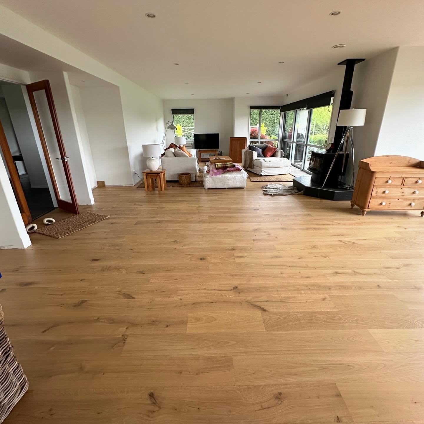This installation features light oak timber flooring throughout the main living space — chosen for its natural tones and timeless appeal. The layout enhances the home’s open-plan design while allowing the organic grain to shine. Finished with precision and attention to natural flow, the result is a warm, welcoming environment that complements both modern and rustic elements.