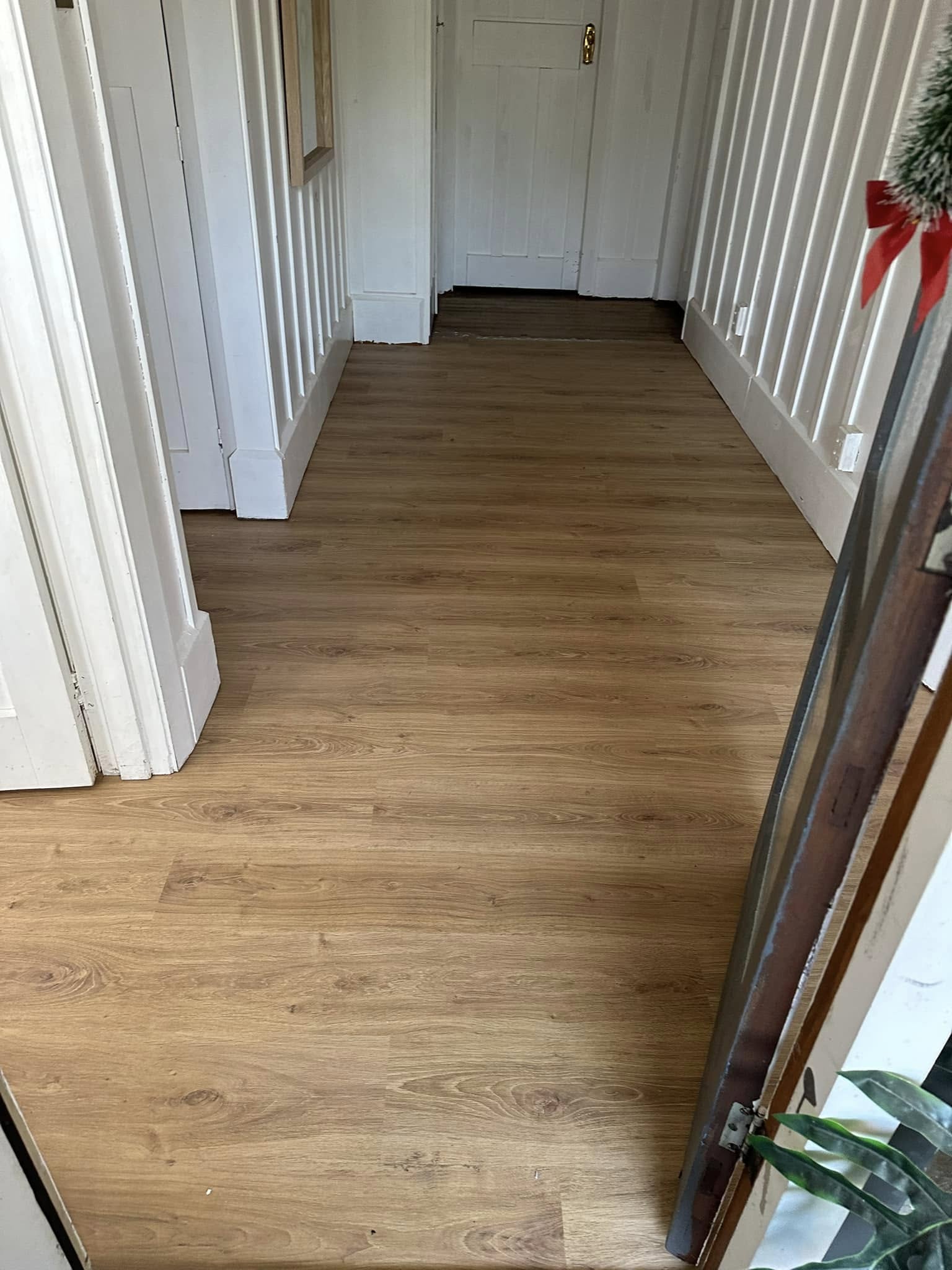 This flooring renovation project features a beautiful wood-look vinyl installation throughout the hallway and kitchen areas. The natural tones of the vinyl bring warmth and texture to the space, enhancing the home’s traditional charm while providing a modern, durable surface. The flooring seamlessly connects different rooms, creating a cohesive flow that unifies the home’s interior. Perfect for high-traffic areas, this vinyl flooring is both stylish and practical, offering easy maintenance and resilience for daily wear.