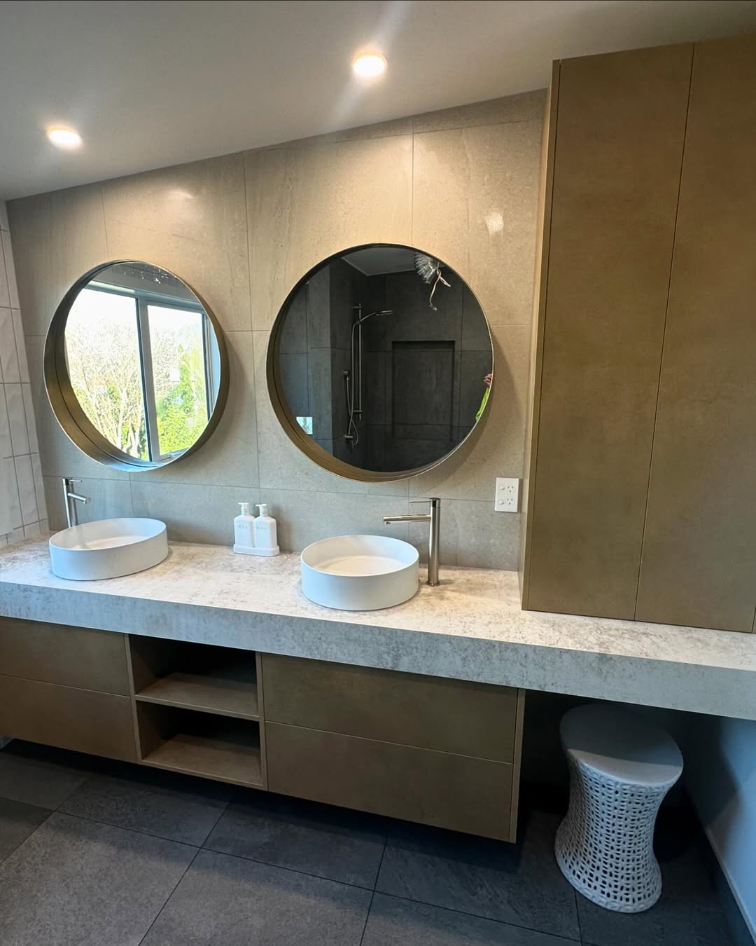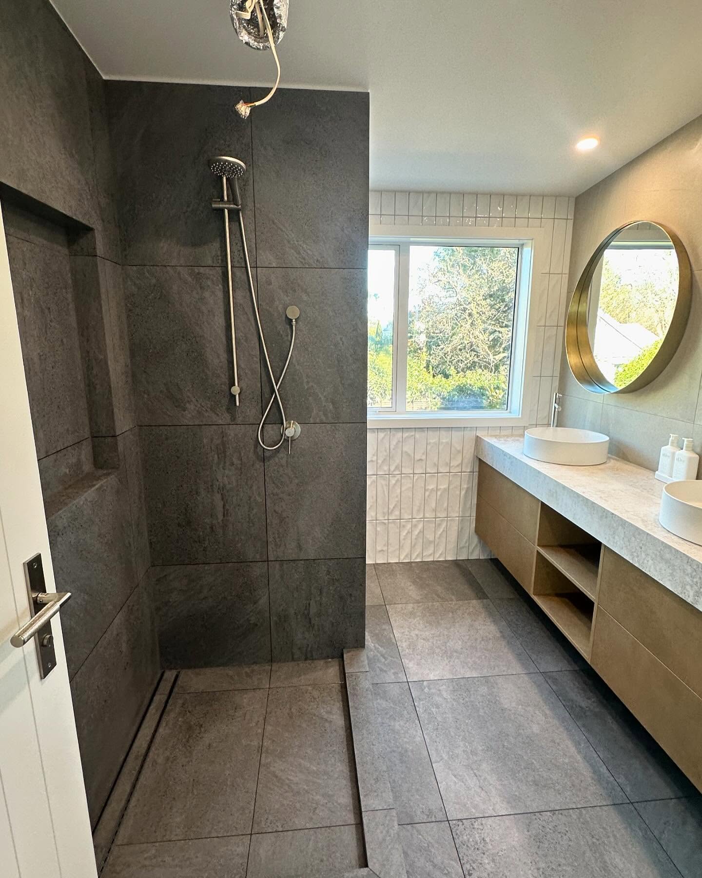 This bathroom remodel project features a luxurious and contemporary design with a focus on high-quality materials and precision tiling. The space includes large-format dark tiles that create a sleek, modern look, paired with textured white wall tiles for added visual interest. The walk-in shower area showcases custom tile work with integrated shelving, while the wall-hung toilet and minimalist fixtures contribute to a clean, streamlined aesthetic. The double vanity is complemented by round mirrors and ample storage, blending style with functionality. This remodel exemplifies a sophisticated approach to bathroom design, providing a relaxing and elegant environment.