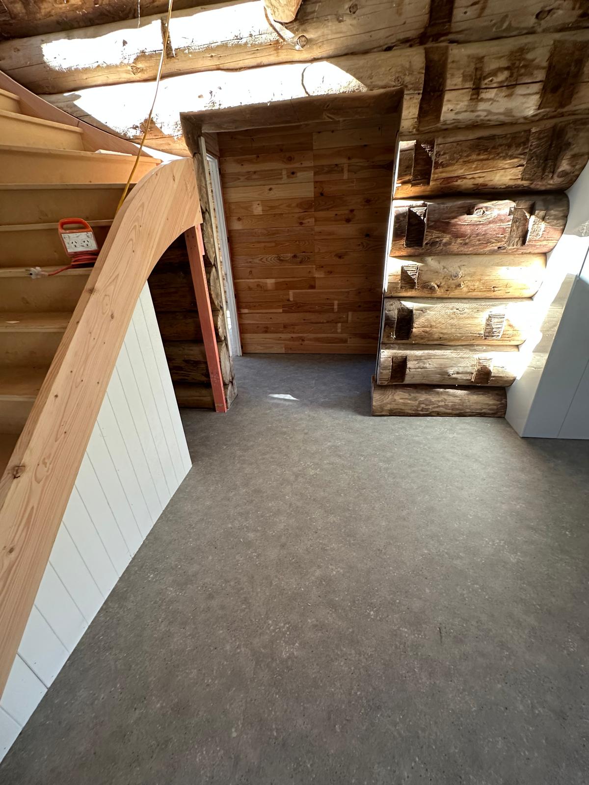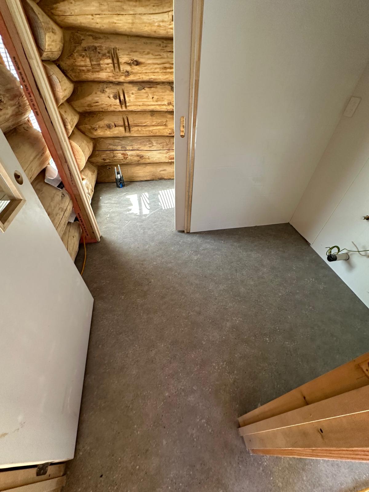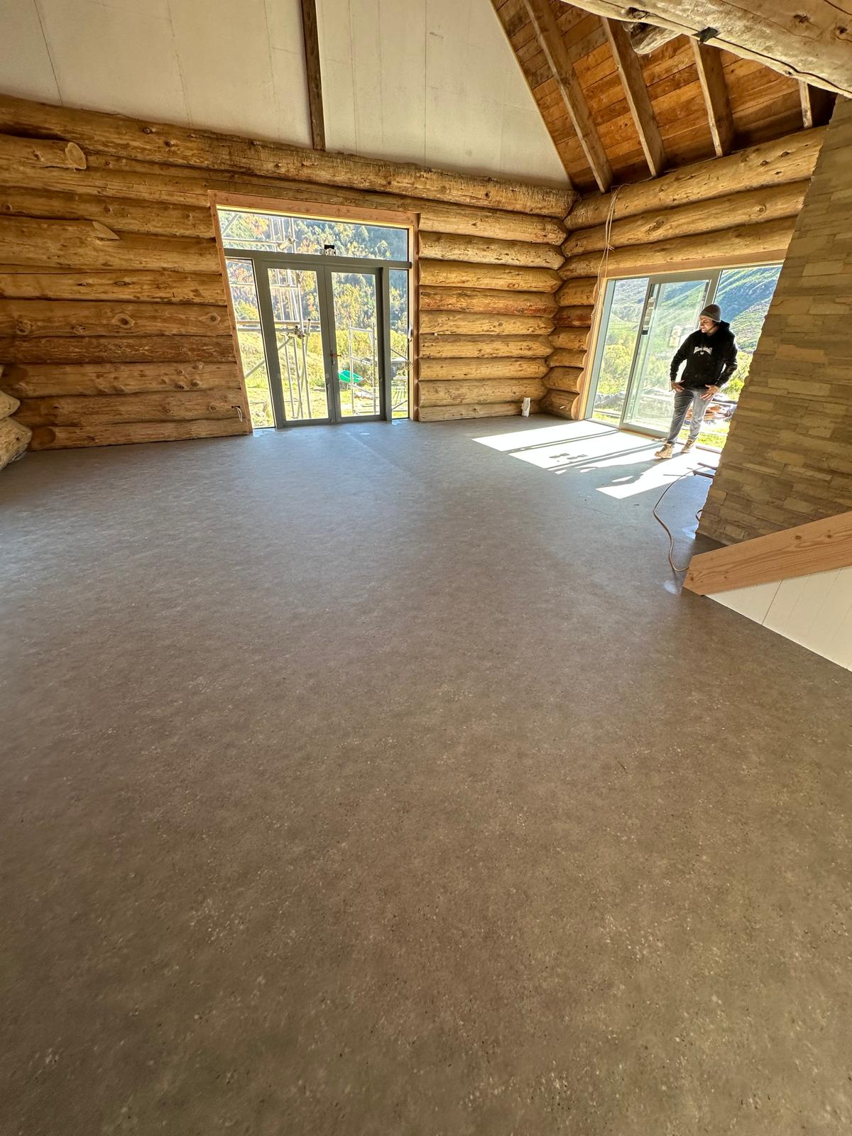 Set against the backdrop of natural log walls and pitched timber ceilings, this project required a flooring solution that could bring durability without compromising the rustic charm of the space. We installed a seamless vinyl floor in a soft, earthy tone — chosen to balance the rich wood textures while providing long-lasting comfort and practicality. The result is a warm, grounded interior that feels both natural and modern.