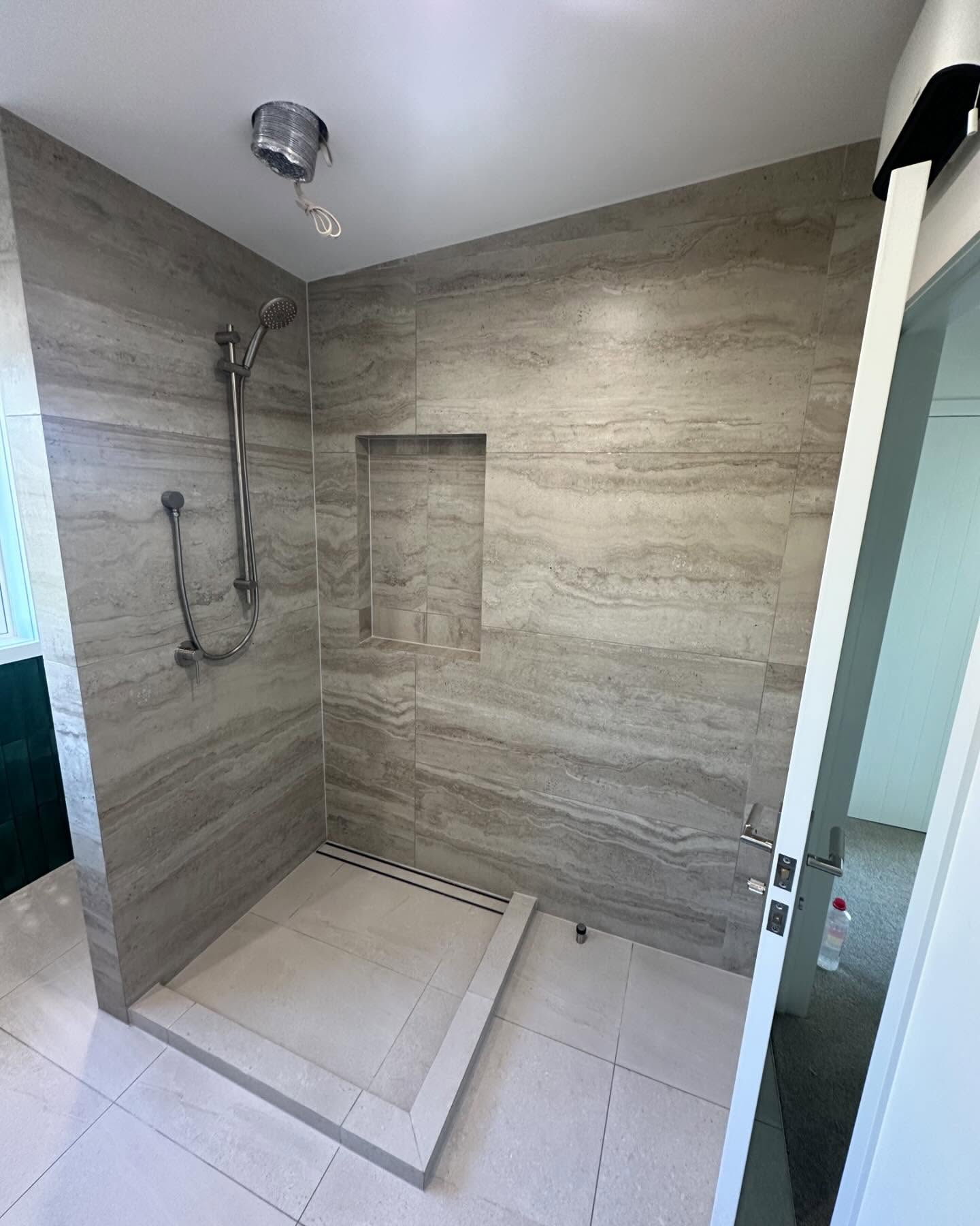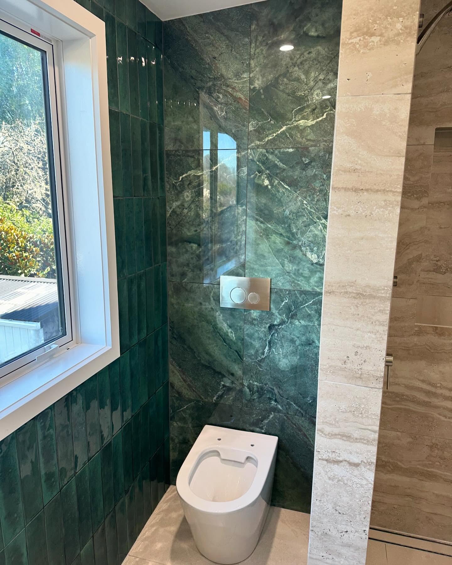 This bathroom renovation features a contemporary design with an emphasis on natural stone and accent tiling. The walk-in shower area is clad in warm-toned stone tiles, creating a calming, spa-like atmosphere. A recessed shelf adds both functionality and style to the shower. The vanity wall incorporates striking emerald green tiles that contrast beautifully with the stone textures, adding depth and character to the space. The wall-hung toilet sits against a feature wall of vibrant green marble-look tiles, providing a modern and luxurious touch. This project exemplifies high-end finishes and thoughtful design choices that balance aesthetics and practicality